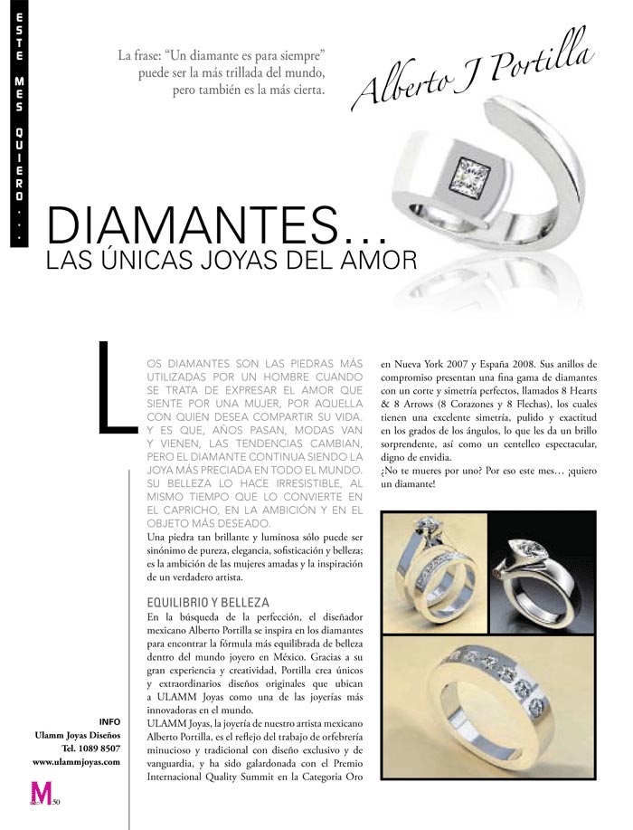ULAMM JOYAS nace de la inquietud del Diseñador Mexicano Alberto Portilla, por encontrar la fórmula más equilibrada en el Mundo Joyero. La experiencia en el taller y la comercialización de metales fue lo que logro amalgamar el concepto integral que distingue el Diseño de su obra.